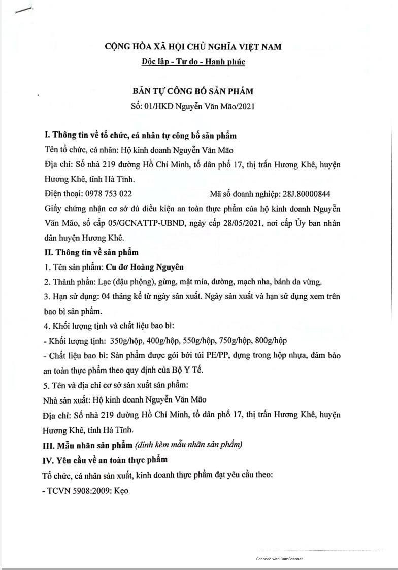 tự công bố chất lượng sản phẩm cu đơ Hoàng Nguyên số: 01/HKD Nguyễn Văn Mão/2021